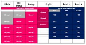 De niveaus sluiten onderling aan op elkaar en zijn in lijn met de KNGU middenbouw supplementen.